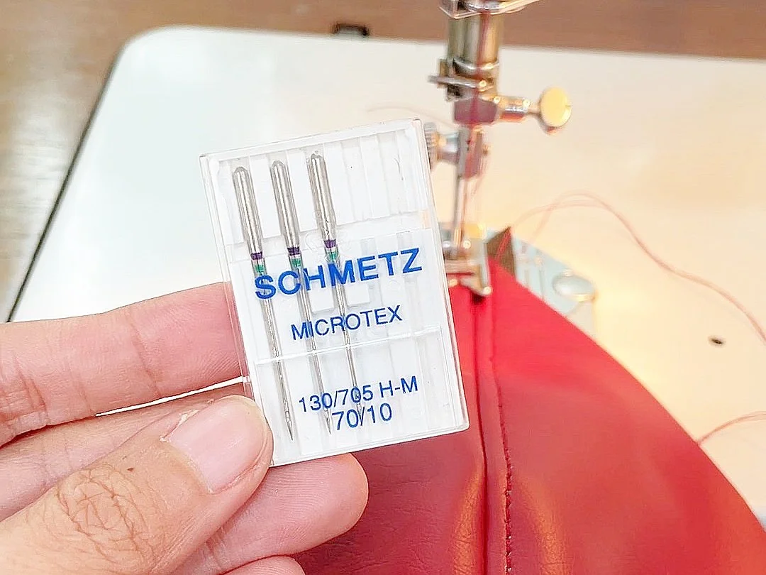 Using the Schmetz microtex needle (foreground) after realising the cuts and damage to the faux leather along the stitch line created by leather needle (background)